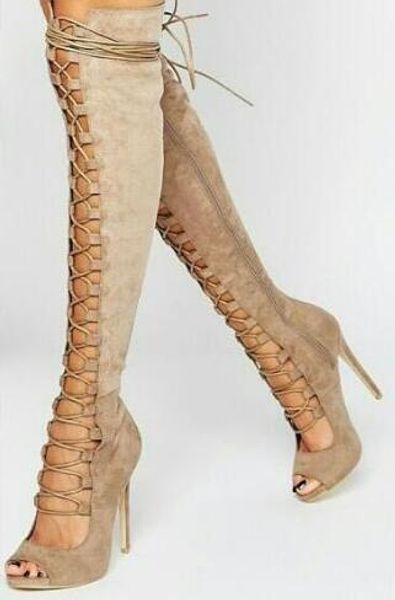 Soft genuine suede leather caps the peep toe and single strap, while more straps cross and tie above the ankle.