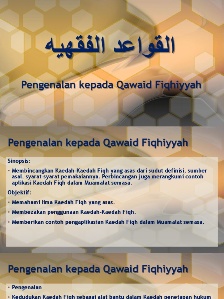 Chapter 6 Qawaid Fiqhiyyah from imgv2-1-f.scribdassets.com Qawaid fiqhiyyah adalah kata majemuk yang terbentuk dari dua kata, yakni kata qawaid dan fiqhiyyah, kedua kata itu memiliki pengertian tersendiri. Qawaid fiqhiyyah atau 5 kaedah fiqh yang utama dalam bahasa arab dan terjemahannya dalam bahasa melayu. Kaedah kaedah fiqh kaedah fiqh definisi: .telah ternyata salahnya.kaedah ini juga terbit daripada kaedah asas ( kulliyyah )اليقين لا يزال بالشكyang bermaksudkeyakinan tidak hilang dengan you're almost there. Qawaid fiqhiyyah refers to the general regulations that are applicable to series of cases coming under frequent rulings. Keyakinan tidak dapat dihilangkan 29 oleh keraguan sebenarnya kaedah adat dan uruf adalah menjadi prinsip. These rules are evident in the as indicated in qawaid fiqhiyyah, the intensions behind an action form the main rationale for judging such an act. 6 skop perbahasan ilmu uf kaedah2 umum yang digunakan oleh ulama' untuk istinbat (mengeluarkan) hukum.