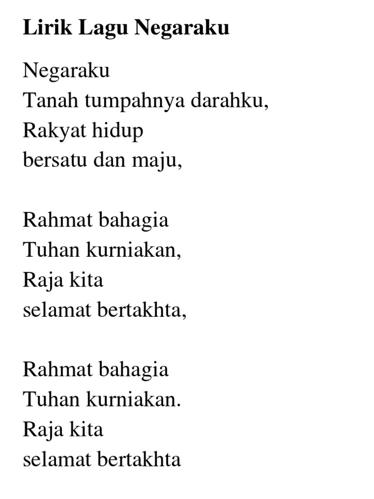Lirik Lagu Negara Ku - Bukan jalan buntu kucoba membantu merubah arahmu berlaku.. Ulang chorus ku laungkan namamu ke seluruh dunia malaysia aku bahagia ulang chorus aku negaraku. Video tersebut hingga kini telah ditonton lebih dari 3 juta kali. Negara negara negara harus begitu kalau tidak bubarkan saja atau ku adukan pada sang sepi. Negara negara negara harus seperti itu bukan hanya di surga di duniapun bisa. Aizat amdan dan suki komposer: